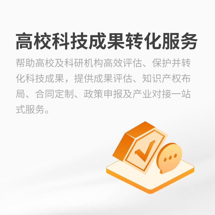 帮助高校及科研机构高效评估、保护并转化科技成果,提供成果评估、知识产权布局、合同定制、政策申报及产业对接一站式服务。